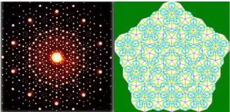 準(zhǔn)晶,是一種介于晶體和非晶體之間的固體,它是由一位叫達(dá)尼埃爾·舍特曼的以色列物理學(xué)家發(fā)現(xiàn)的。1982年4月8日,舍特曼在觀察一種錳鋁合金的時(shí)候,發(fā)現(xiàn)在自己的電子顯微鏡上,出現(xiàn)了一種旋轉(zhuǎn)36°對(duì)稱的圖形。沒(méi)過(guò)多久,他又在合金中發(fā)現(xiàn)了一種72°旋轉(zhuǎn)對(duì)稱的圖形,類似于下面兩幅圖。
