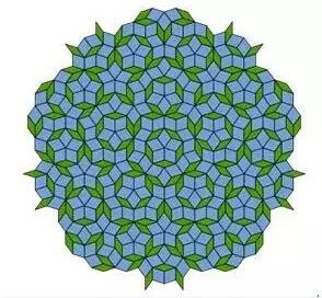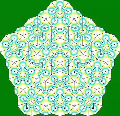 可以看出,很明顯,圖的細(xì)節(jié)上是非周期性的,它確實(shí)不像傳統(tǒng)的晶體模型,能提取一種無(wú)限重復(fù)的圖案。但是整體來(lái)看,它又具有明顯的規(guī)律性。這種由非周期性的圖案鋪滿整個(gè)平面的構(gòu)思,來(lái)自于和舍特曼同時(shí)期的英國(guó)數(shù)學(xué)家彭羅斯。如下圖中,兩種不同的圖形制成的整個(gè)平面的平鋪圖,便是大名鼎鼎的彭羅斯拼圖。彭羅斯拼圖跳出了傳統(tǒng)的正方形拼圖的觀念,巧妙地采用了一系列非周期性的磚組,構(gòu)成了一系列規(guī)則的圖案。這從數(shù)學(xué)的角度,有力地證明了準(zhǔn)晶存在的可能性,肯定了舍特曼的工作。彭羅斯本人也獲得了1988年的沃爾夫獎(jiǎng),這是數(shù)學(xué)界的最高獎(jiǎng)之一。